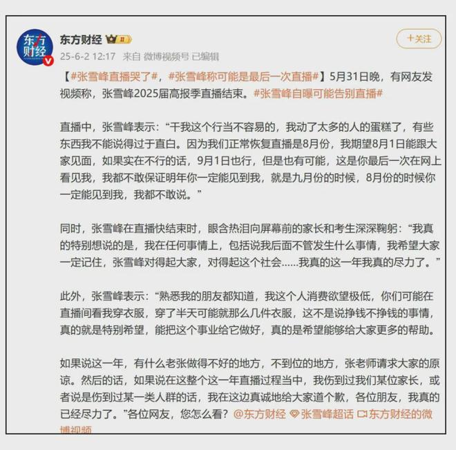 6月2日,#張雪峯自曝可能告別直播#的話題衝上微博熱搜,引發廣泛關注。