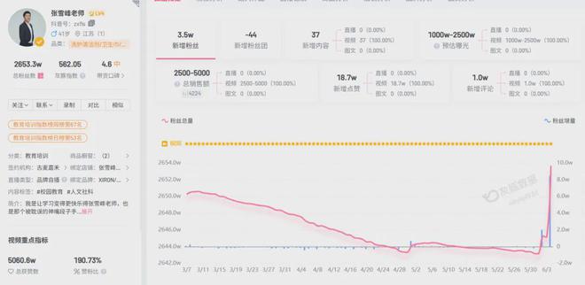 “灰豚數據”顯示,5月30日,張雪峯抖音粉絲為2643.4萬,熱搜爆發後,6月2日新增2萬粉絲,6月4日,張雪峯怒斥“學歷貶值無用論”再次引發熱議,而其抖音粉絲再增8.5萬。而在此前近三個月,他的粉絲數幾乎處於持續下降狀態。