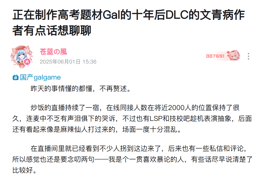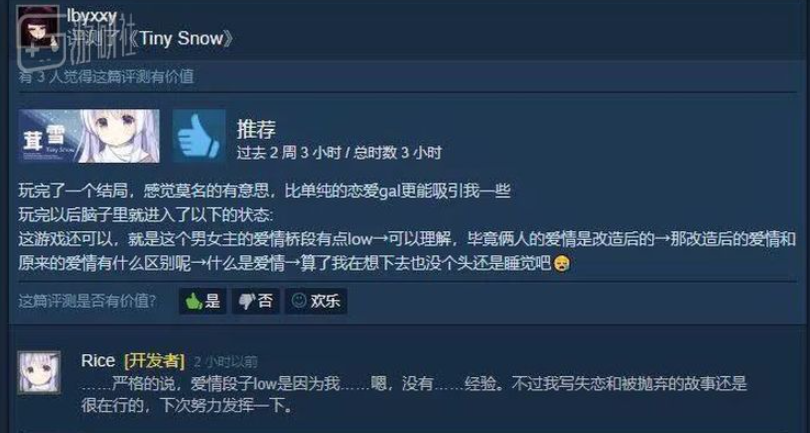 這段對白放在6年前贏得了網友們的好感,為他的遊戲換來了可觀的銷量數據。而現在是2025年,製作一款以失戀、被人拋棄為主題的Galgame肯定不是什麼好主意,炒飯的發言多半隻會被當成“犯罪預告”。