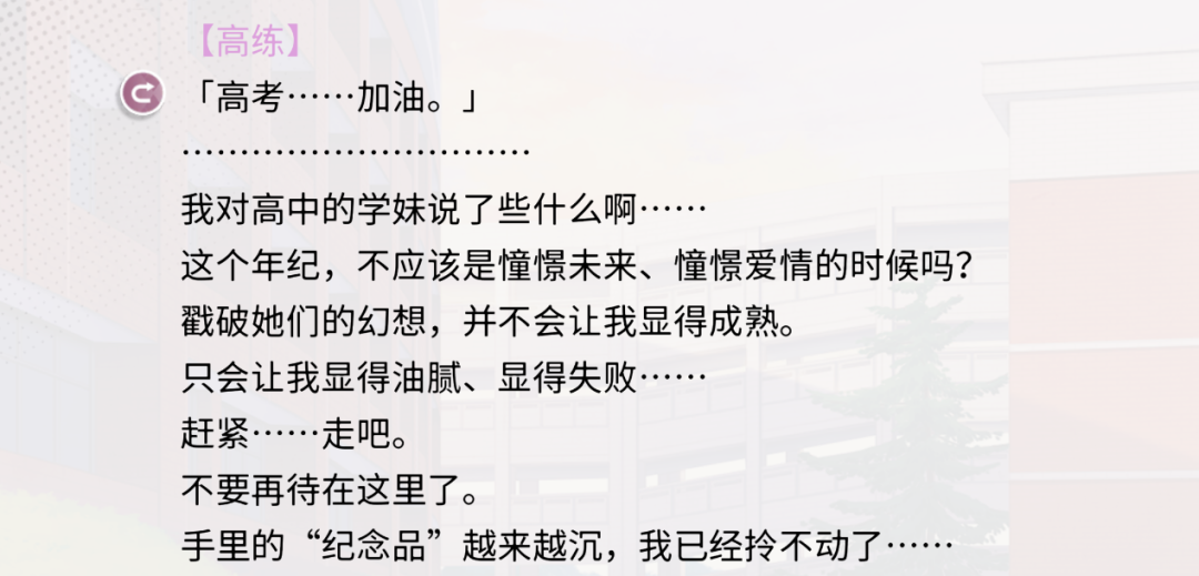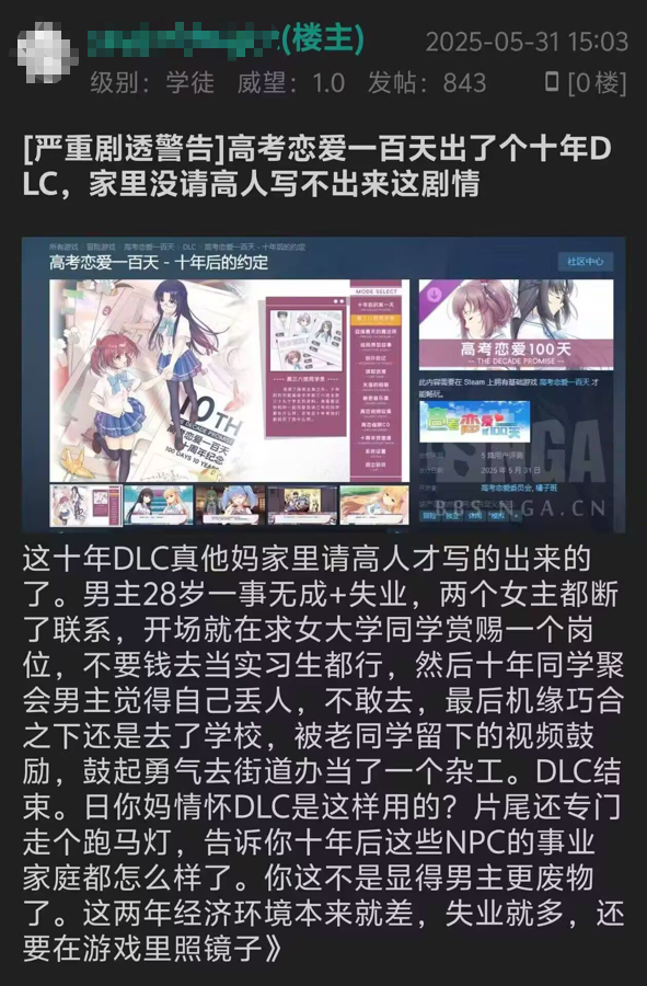 單論DLC本身的劇情,基本符合這位NGA老哥的描述。在過去的十年間,男主頹廢無能,畢業後的履歷一行字就能寫完。把自己所有的精彩都留在了那一百天裏的主角,自此之後的人生像是停滯了一樣,再無波瀾與驚喜。