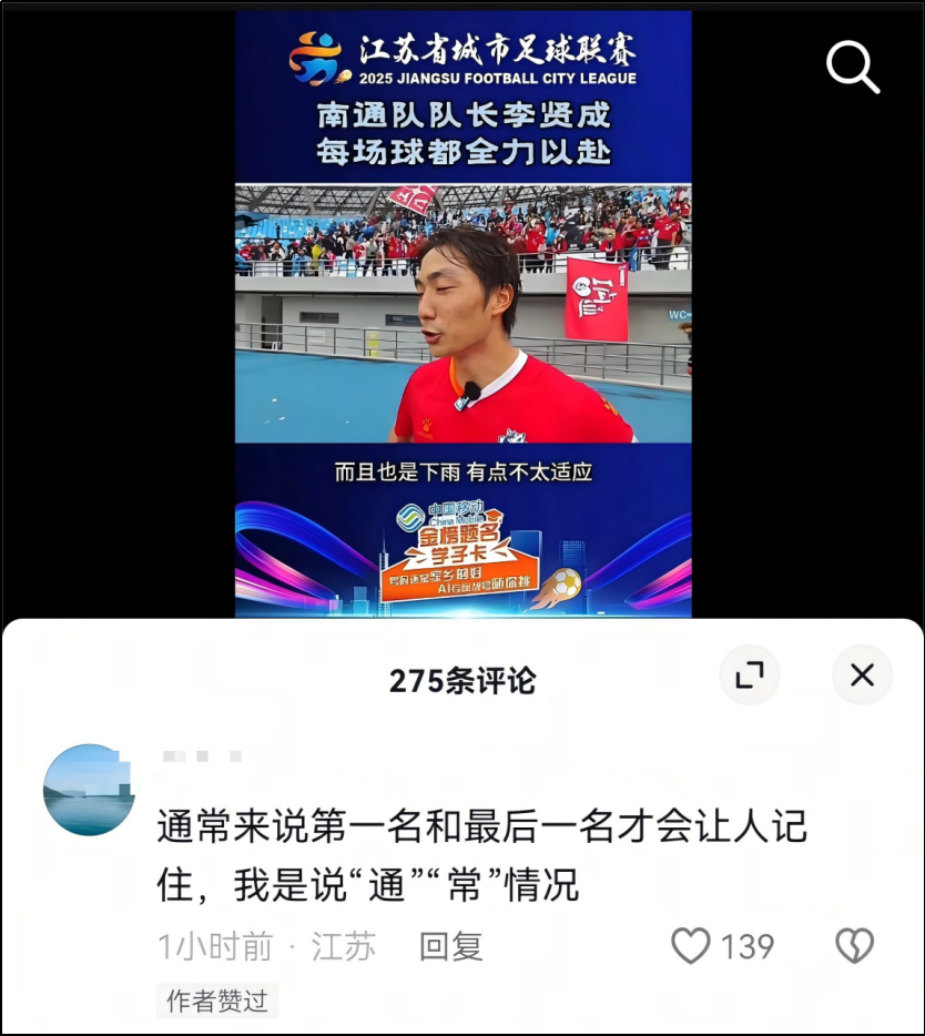贏球后南通隊員説:通常來説第一名和最後一名容易被人記住。