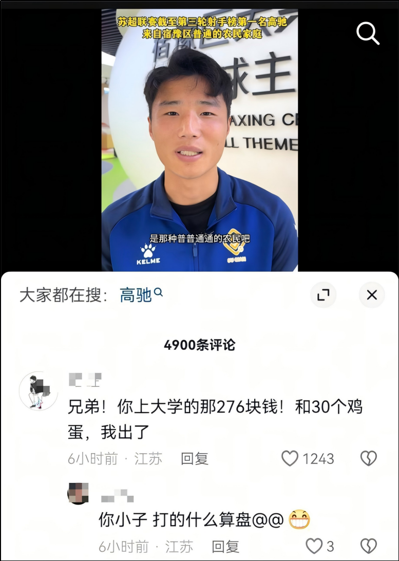 宿遷隊的高馳,排射手榜第一。他來自普通家庭,家庭月收入四五千。