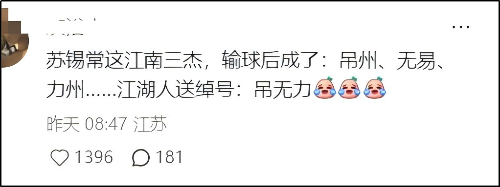 經濟發展不錯的蘇州、無錫、常州反而墊底了。所以網友取出了各種綽號來嘲笑。