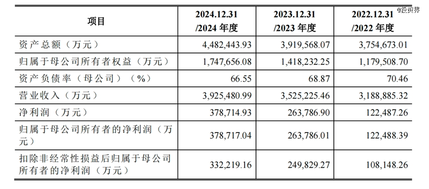 招股書顯示,2022年至2024年,中策橡膠實現營業收入分別約為318.89億元、352.52億元、392.55億元,對應實現淨利潤12.25億元、26.38億元、37.87億元。其中境外銷售尤其亮眼,比例達46.91%、47.93%和48.32%,撐起了業務“半邊天”。