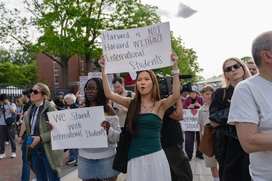 ▲2025年5月,哈佛學生手持“缺少國際學生的哈佛不是哈佛”標語,抗議美國新政府對國際學生的限制。