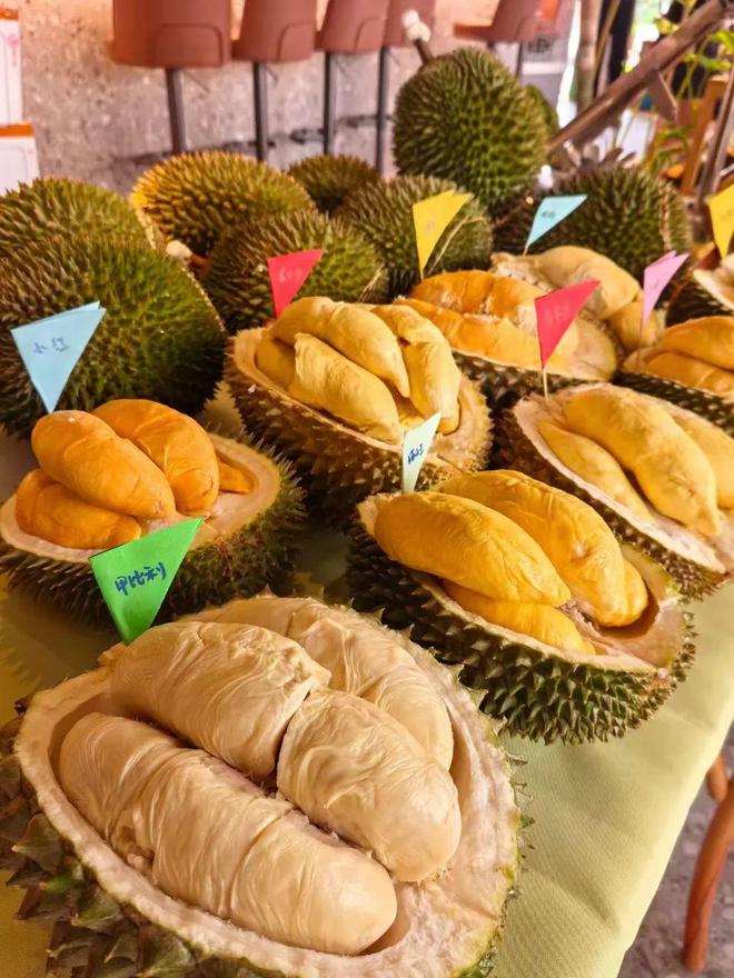 在國內最常見且最好買品種,基本只有金枕。新鮮貓山王也不多,而馬來西亞的榴蓮自助裏,大有一副擺滿榴蓮族譜的架勢。