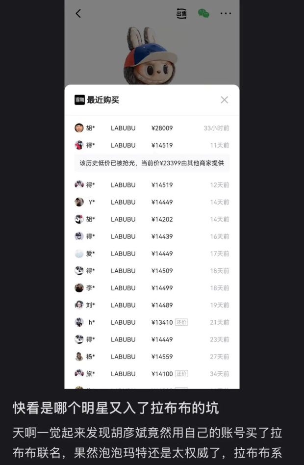 拉布布與Vans聯名款,發售價為599元一度被炒到近1.5萬,最近歌手胡彥斌在某物購入該款花了2.8萬。