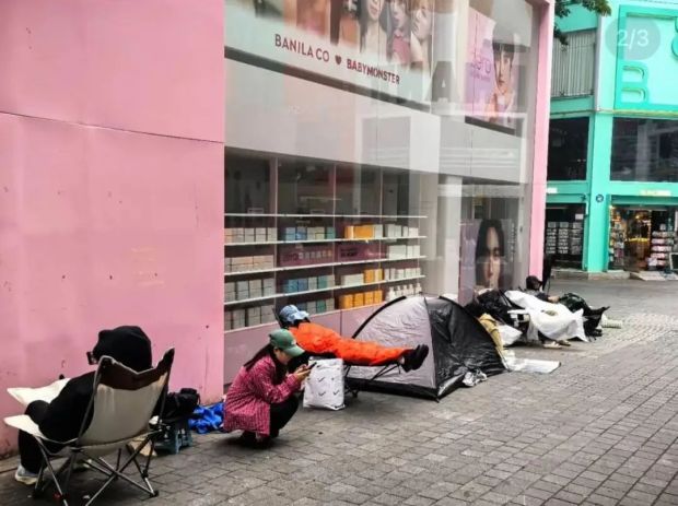 韓國首爾明洞的寶子拿着毛毯、小馬紮在門口蹲守一夜,洛杉磯的家人們還帶了帳篷。
