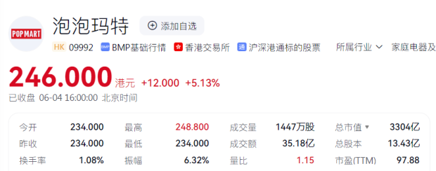 ● 截至昨日收盤,泡泡瑪特港股行情