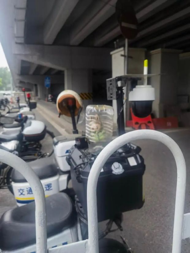 拉布布坐在交警的執法車後座,交警還貼心地給它罩了個防護罩。