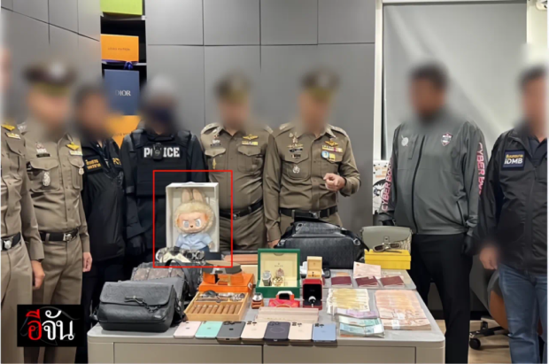 甚至在泰國警方抓捕的兩名電信詐騙頭目的贓物展示裏,拉布布在一眾奢侈品格外顯得清新脱俗。