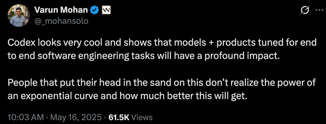 Windsurf 與 OpenAI 的「親密」在今年 4 月開始公開化。Windsurf CEO Varun Mohan 曾參與 GPT-4.1 模型的發佈直播。在 OpenAI 推出新的編程產品時,他還特別在社交媒體上吹捧了一下,贊其「看起來非常酷」,並稱「那些對此視而不見的人,既沒有意識到指數曲線的威力,也不明白這項技術將取得多麼巨大的進步」。