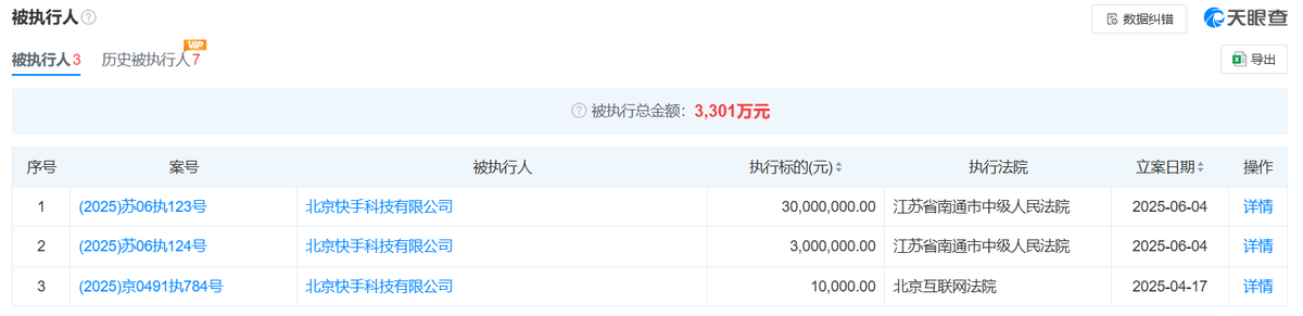 天眼查法律訴訟信息顯示,**近日,北京快手科技有限公司(以下簡稱“快手”)新增2條被執行人信息,執行標的合計3300萬元,**涉及著作權權屬、侵權糾紛;侵害其他著作財產權糾紛案件,執行法院為江蘇省南通市中級人民法院。關聯司法案件為北京愛奇藝科技有限公司與中國電信股份有限公司南通分公司,北京快手科技有限公司等相關著作權權屬,侵權糾紛