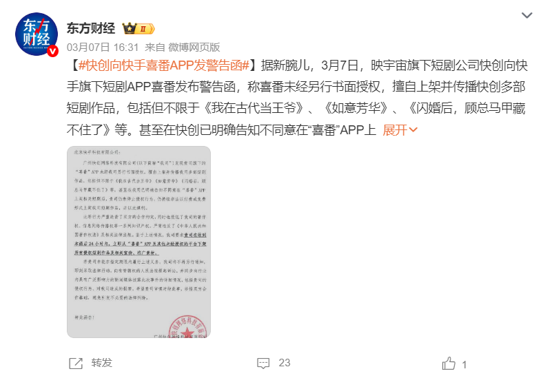 圖片來源:微博截圖3月7日,映宇宙旗下短劇公司“快創”向快手旗下短劇APP喜番發出警告函。