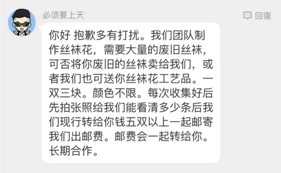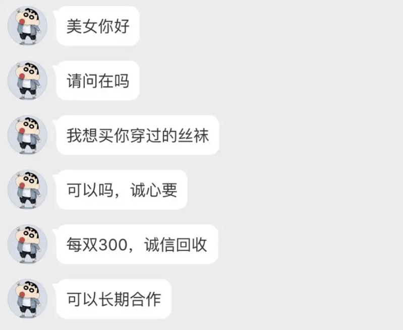 一類是低價的,開價幾塊、幾十塊,裝作無害地説“能不能收一雙你穿過的襪子”,這種人大概率是真有癖好,買回去收藏、聞、甚至別的什麼操作。