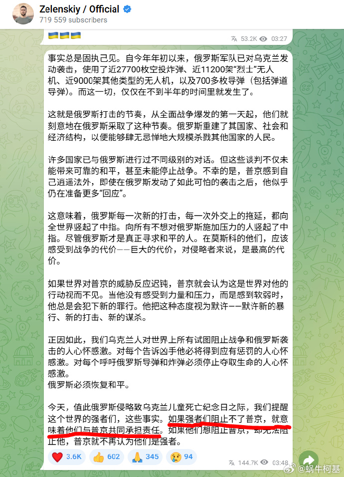 一邊發諺文跪舔李在明,一邊發檄文討伐普京的同時暗諷特朗普,稱“強者”要和普京一起承擔戰爭罪責。這篇檄文的發佈時間剛好就在普京和特朗普通電話之後。
