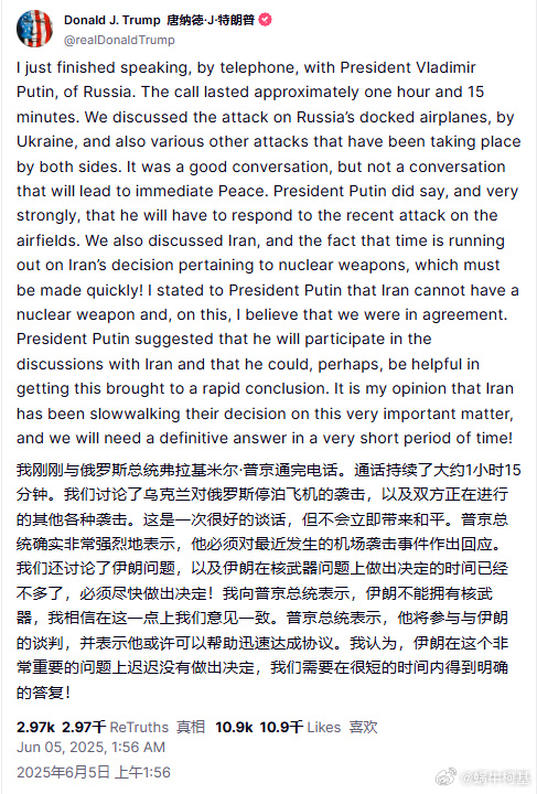 🟥特朗普告訴普京,美國並未被告知襲擊俄羅斯機場的計劃;