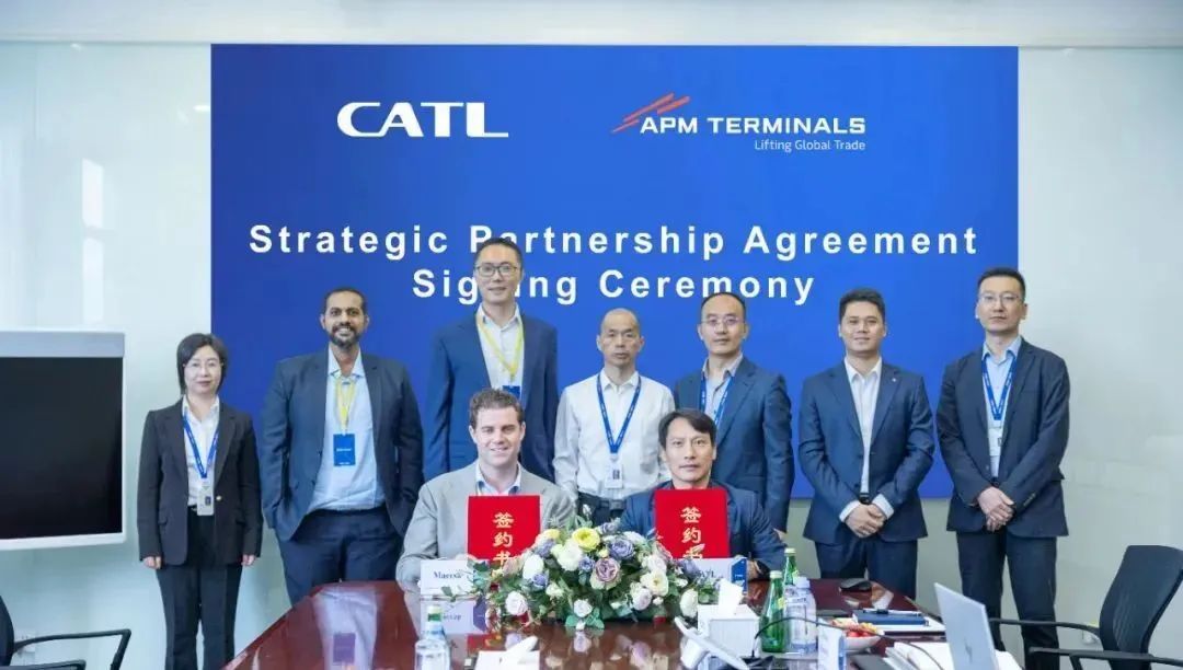 馬士基碼頭公司全球資產採購總監Grant Morrison與寧德時代海外業務執行總裁李小寧代表雙方簽署合作協議。馬士基碼頭公司採購部上海負責人劉廣通、馬士基碼頭公司採購部孟買負責人Rahul Aiah、寧德時代海外商用解決方案總監餘峯和寧德時代海外商用業務總監安寶生等出席簽約儀式。