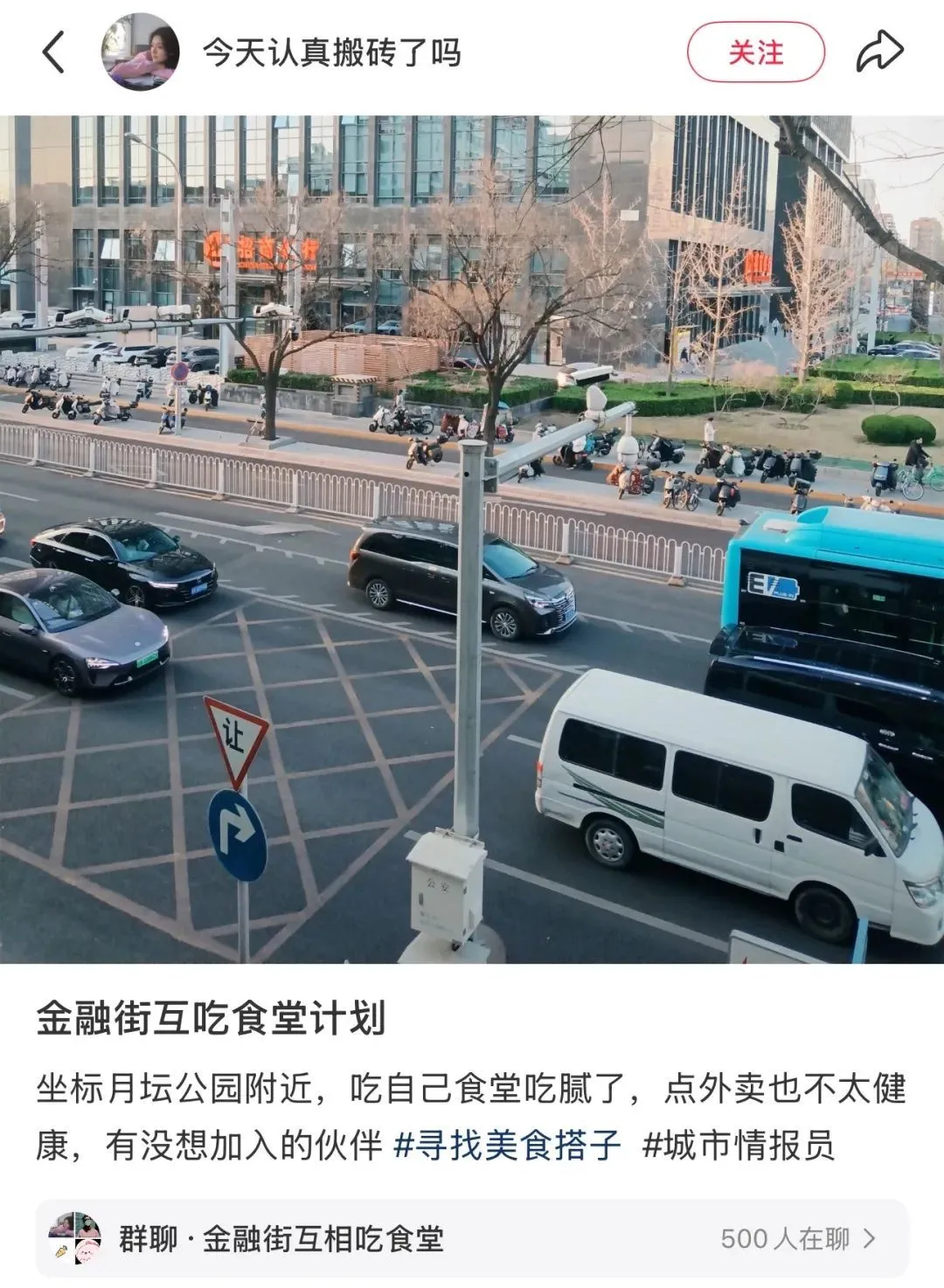 還有網友發起了“金融街互吃食堂計劃”,方便附近的打工人們互通有無、信息共享。