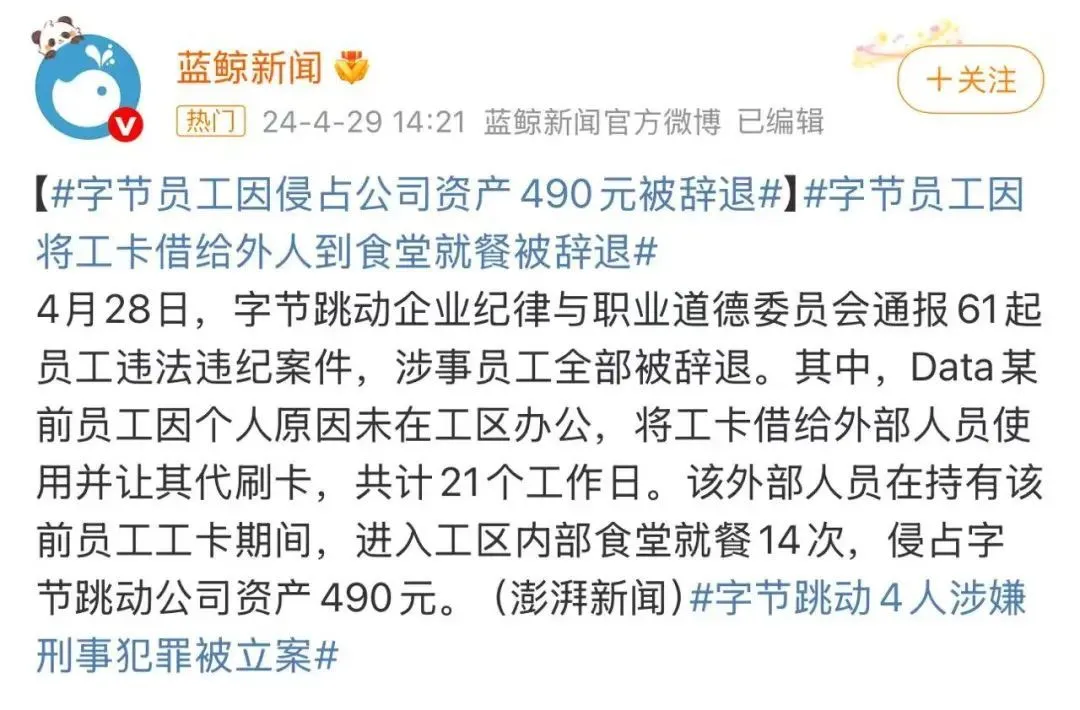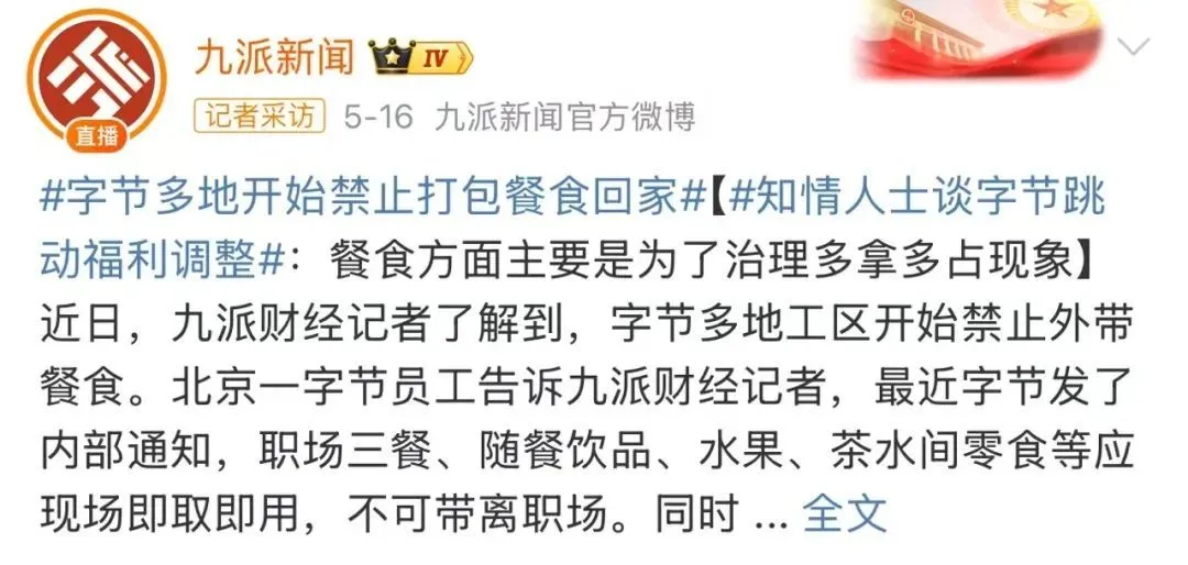 例如字節跳動之前通報員工將工卡外借代刷食堂,部分工區開始禁止打包餐食回家等舉措,就引發了很多關於“大廠福利縮水”的討論。