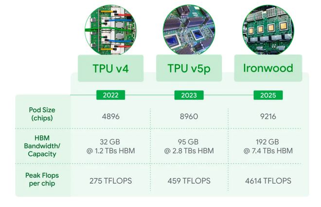 最新的TPU在今年4月發佈,谷歌已經推出了第七代張量處理單元(TPU)Ironwood。谷歌稱,在大規模部署的情況下,這款 AI 加速器的計算能力能達到全球最快超級計算機的24倍以上。