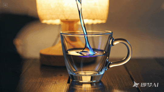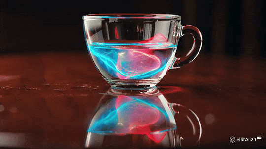 可靈2.1的視頻流暢度比較好,桌面的倒影非常真實,會隨着光線變化而變化。這顯示了可靈對物理效果的理解。但茶杯內的流光有些單薄,沒有完全達到提示詞的要求。