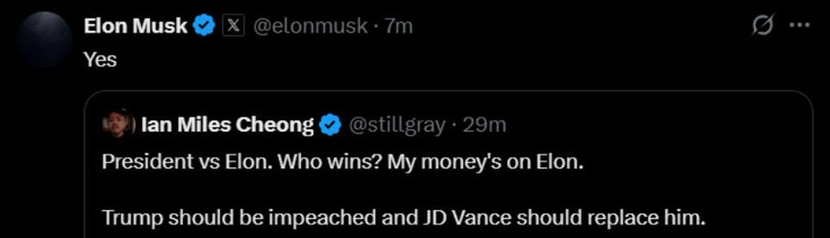 當天,社交媒體平台 “X” 上發佈了一則支持彈劾特朗普的貼文,字裏行間明確寫道:“Trump should be impeached and JD Vance should replace him.(特朗普應該被彈劾,JD・萬斯應該取代他。)”面對這一觀點,馬斯克迅速現身評論區, 簡短有力的回覆到: “ Yes(是的)” 。這個回覆,字數不多,只有短短的兩個字,但破壞力巨大,就像在熊熊燃燒的烈火上又倒了兩桶汽油,把兩人的矛盾衝突推向了新的高潮。