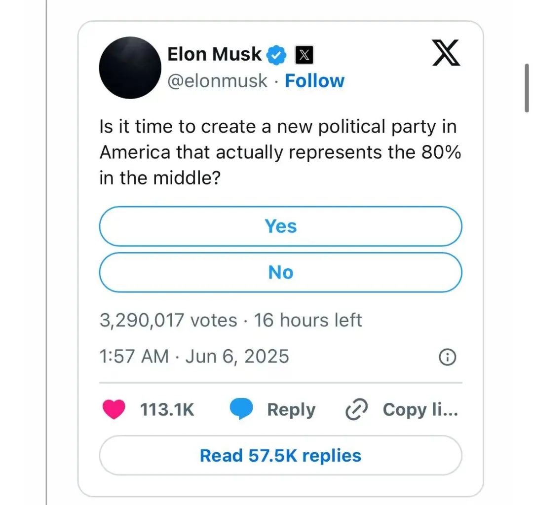 然後馬斯克直接發起個投票,詢問美國人是不是需要一個新黨派:(大部分人選了yes)