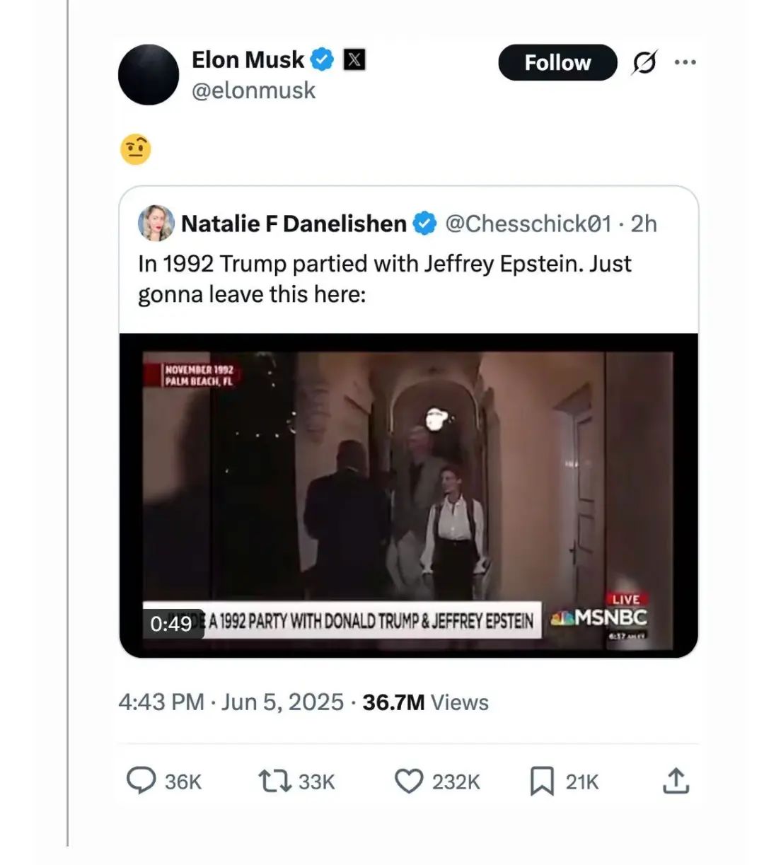 馬斯克分享了一個視頻,暗示特朗普和愛潑斯坦私交頗深。