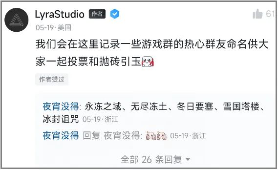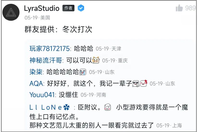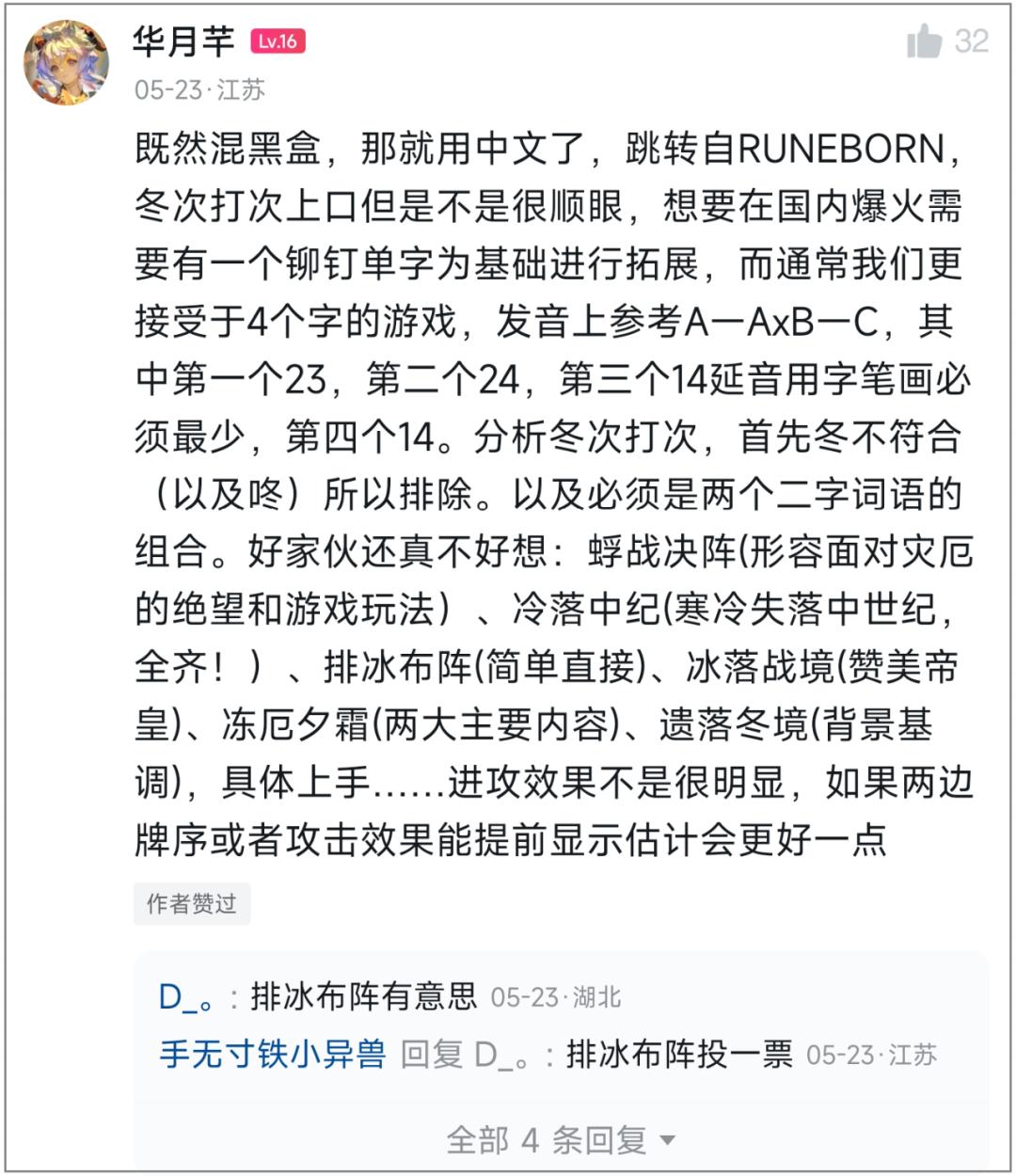 其實讓我起名字,也只能想到《寒霜禁域》或者《凜冬絕境》之類的常規套路。但玩家們的智慧就不一樣了,除了上圖裏的《冷鋒》,點贊最高的答案,是朗朗上口,也符合遊戲一部分原意的——《冬次打次》。