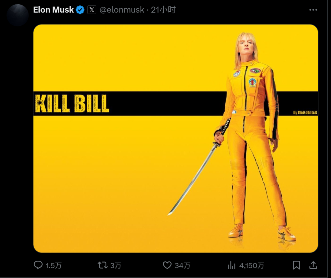 1)昨晚我在睡覺前,已經發現馬斯克在其“X”平台賬號上頻發“暴論”。最明顯的就是上圖,馬斯克借用電影《殺死比爾》的海報,公開呼籲美國選民挫敗特朗普支持的“大而美法案”。在英文裏,“比爾”(Bill)這個人名和“法案”(bill)拼寫相同,只是作為人名的Bill首字母要大寫,但是,如果把“KILL BILL”的字母全部大寫,既可以當做電影的名字,也可以當做強調,就達到了一種完美的一語雙關的效果。