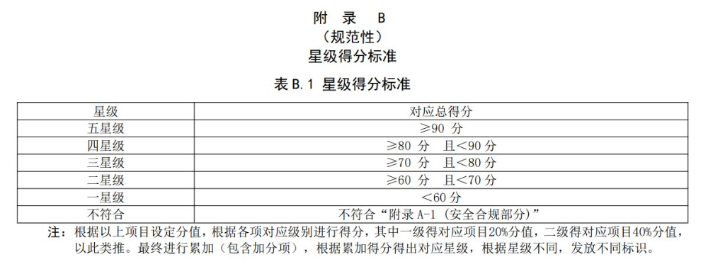 具體咱們一起來看哈,標準裏一共涉及了五個部分,分別是:安全合規、運營效率、服務便利、綠色低碳和其他加分項,然後按照每個項目的分數計一個總分,打星規則可以看看下面這個表。