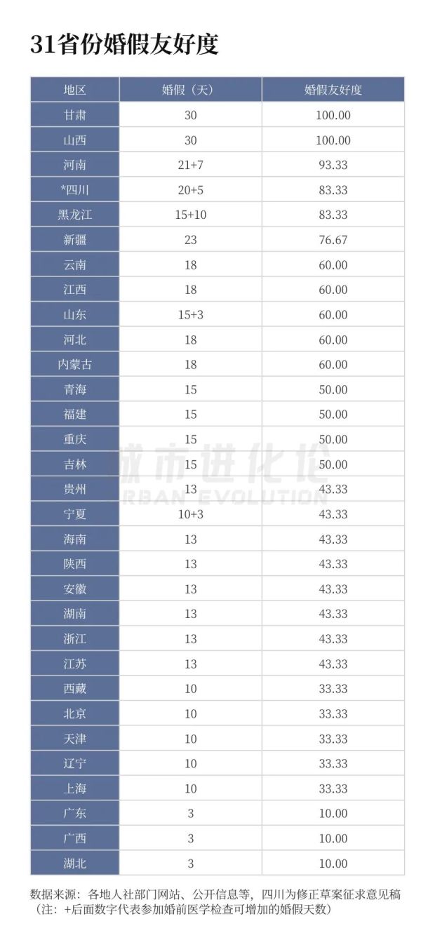 當然,更多的省份在取消晚婚假後,逐步調整了原有的婚假天數。根據城市進化論梳理,甘肅、山西婚假達30天,是全國婚假最長的省份。