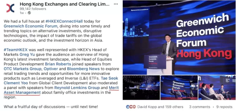 格林威治論壇起源於美國格林威治小鎮,是全球另類投資行業最具影響力的論壇之一。2023年,其首次在美國以外的地方——香港舉辦。2025年5月22日,格林威治經濟論壇(香港)再次在香港交易所舉辦。