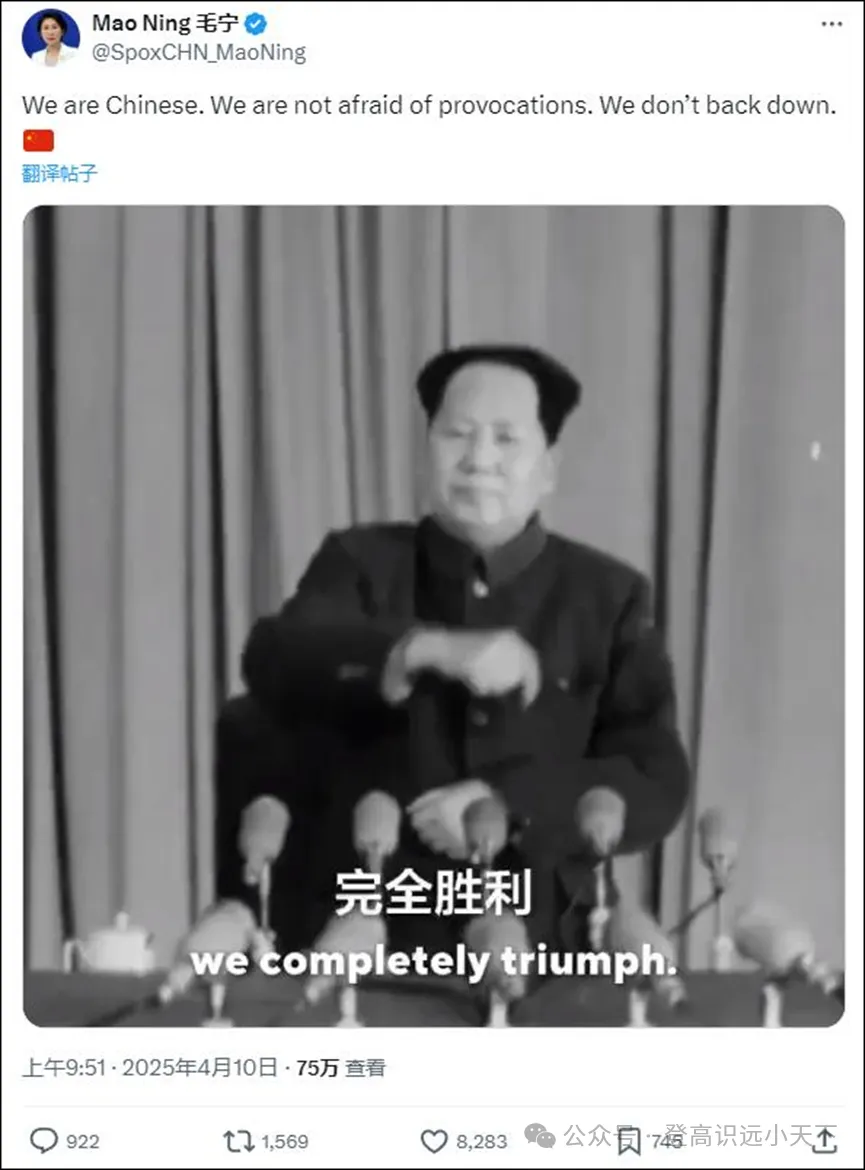 特朗普上台之後對中國展開關税之戰,大有黑雲壓城城欲摧之勢。2025年4月10日,中國外交部發言人毛寧在社交媒體X平台上發文,並配上了一段毛主席當年的講話視頻。毛主席説:“時間要打多久,我看我們不要做決定。過去是由杜魯門,以後是由艾森豪威爾或者美國將來的什麼總統,由他們去決定。就是説他們要打多久就打多久,一直打到完全勝利。”