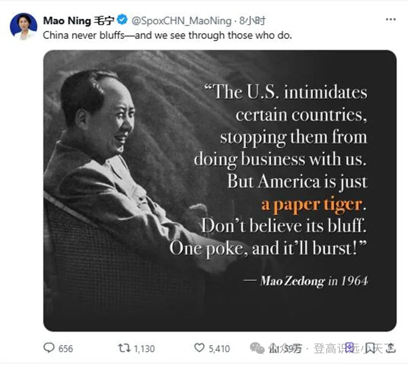 2025年4月11日,中國外交部發言人毛寧在社交媒體X上又分享了一段毛主席語錄:“美國嚇唬一些國家,不讓它們跟我們做生意,美國是隻紙老虎,你們不要相信它,一戳就穿了的。”