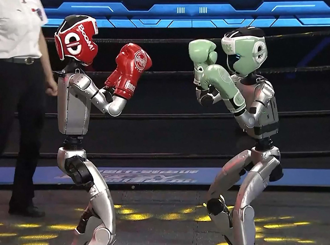 兩個機器人站在擂台上揮拳對戰,三回合計分制,打中頭部得分、摔倒扣分、起不來直接判負。