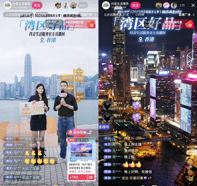 據悉,此次直播活動由抖音生活服務城市奔赴計劃聯合抖音2025綻放多元季、煙火深圳IP共同推出,聯動香港和深圳超40個精選商家,帶來香港特色出遊套餐和深圳餐飲套餐。直播激發眾多用户線上下單團購,前往灣區進行線下消費,為香港的線下文旅搭建了消費新場景。