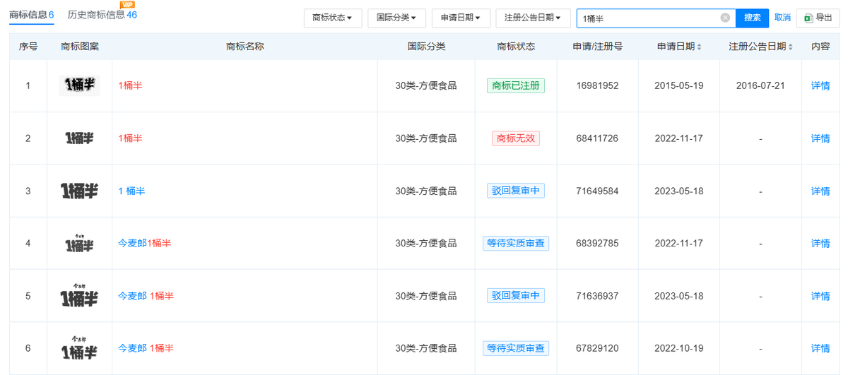 值得一提的是,在方便麪市場,“擦邊式商標營銷”並非個例。今麥郎之前,**白象食品被曝出多半袋面、多半桶面系列產品包裝上顯示的“多半”為註冊商標。**6月4日,白象食品發文致歉並回應此事,表示“多半”商標申請註冊的初心是為了與常規份量產品做區分,便於消費者選購。後續公司將盡快調整“多半”產品包裝,避免引發消費者的誤解。隨後,天眼查曝出,康師傅關聯公司頂益(開曼島)控股有限公司曾申請註冊多枚“一倍半”“1碗半”“1倍袋半”“康師傅一倍半”等商標。