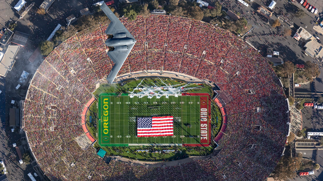 不過,在美國大學橄欖球比賽“玫瑰碗”中,這些戰略轟炸機可是賽場上的常客了。從2005年開始,每年來自密蘇里州懷特曼空軍基地的B-2“幽靈”轟炸機都會參加“玫瑰碗”的開幕式與花車遊行。而在2023年,B-2轟炸機因安全事故臨時停飛,一架B-1B接替了B-2的任務參加了飛越活動。
