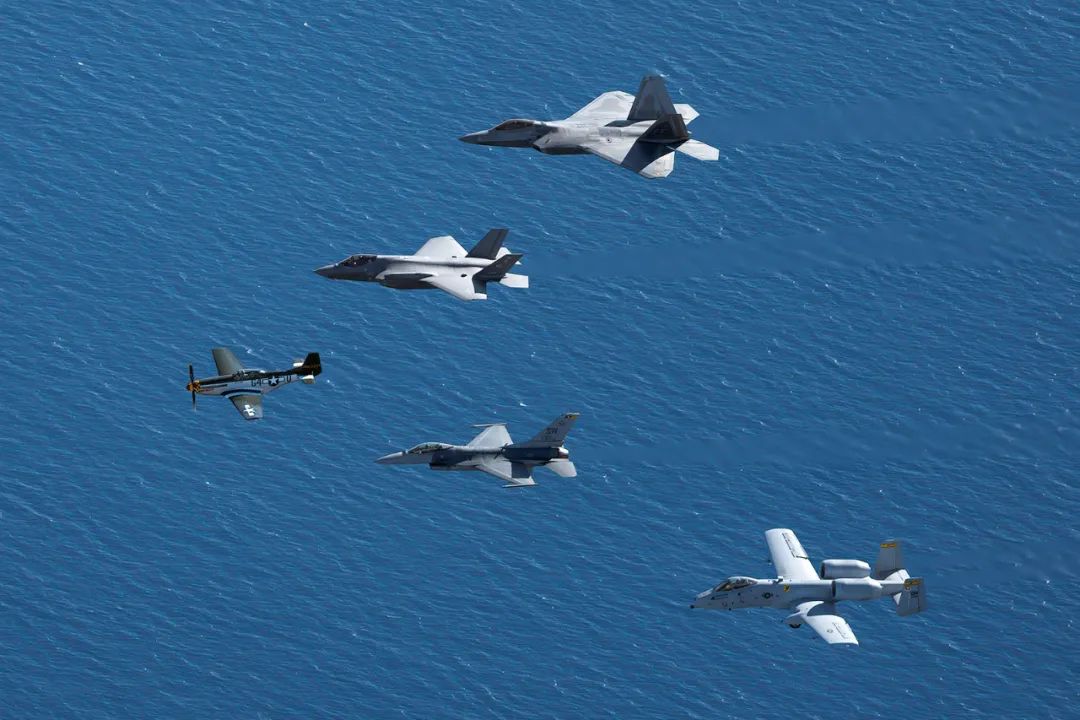 2022年的“超級碗”則是近些年讓軍武菌印象最深的一次。本次表演依舊由美國空軍執飛,一架二戰時期服役的P-51“野馬”戰鬥機作為編隊的長機,帶領着F-16“隼”、A-10“雷電II”、F-35A“閃電II”與F-22“猛禽”四架現代戰機,飛越英格爾伍德索菲體育場的上空。