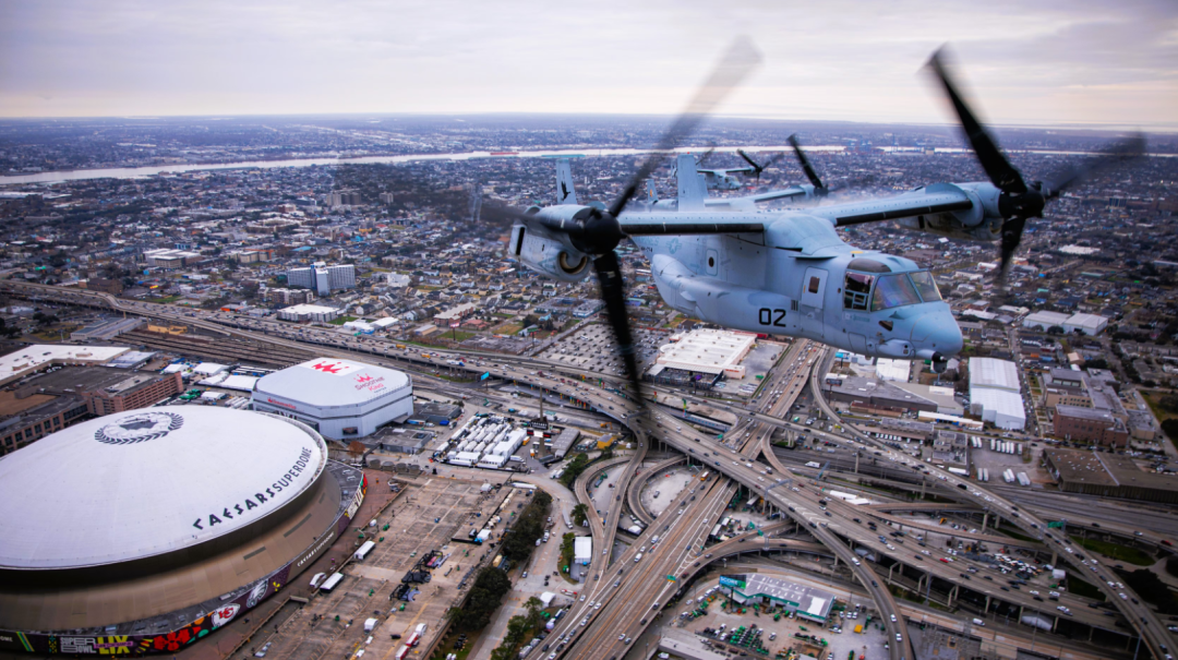 為了能讓各軍種“雨露均霑”,美軍在“超級碗”的飛行表演採取的是輪值模式。比如,今年“超級碗”開幕式的飛越表演就是由美國海軍陸戰隊負責的。來自第542戰鬥機攻擊中隊的2架F-35B“閃電II”戰鬥機、第764和第774中型傾轉旋翼機中隊的4架MV-22B“魚鷹”旋翼機,共計6架飛機飛越了比賽的主辦地新奧爾良凱撒圓頂體育場。