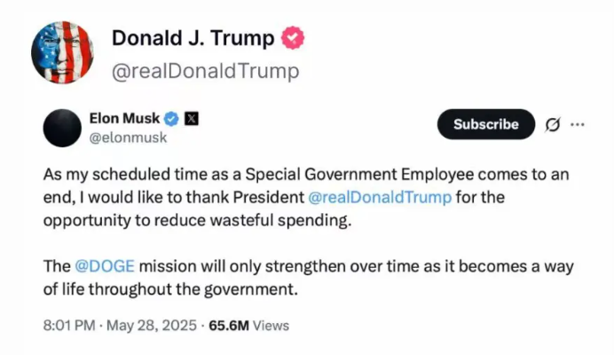 到這兒,特朗普終於是忍無可忍了,開始對曾經的盟友重拳出擊。他先是轉發了馬斯克退出政府效率部的告別帖,明示馬斯克已經人走茶涼,沒資格再對政治説三道四。