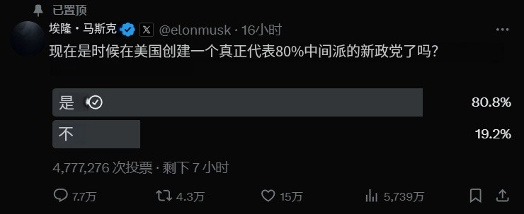靠罵戰發泄了幾天之後,馬斯克在自己賬號置頂了一個投票,是時候創建一個代表80%中間選民的新政黨了嗎?目前的470萬次投票中,八成選擇了“是”……
