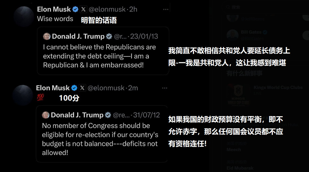 作為一個深諳傳播學的網紅老闆,馬斯克並沒有講太多大道理鼓動網友,他掏出了最簡單高效的武器——迴旋鏢。馬斯克瘋狂轉發特朗普過去的帖子,都是些嚴厲抨擊財政赤字、反對提高債務上限的言論,然後馬斯克還配上陰陽怪氣的評論**:“説得對吶您”、“100分答案”。**