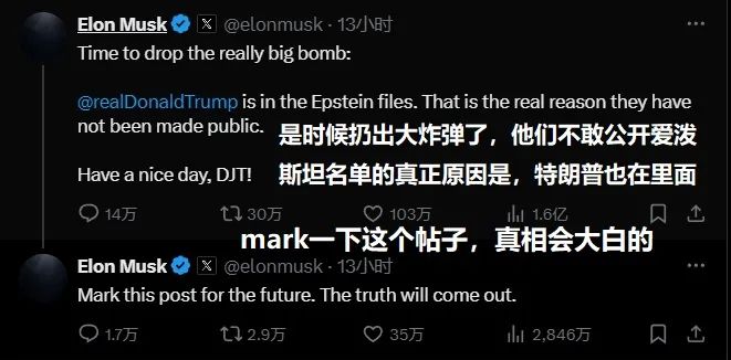 最讓人沒想到的是,馬斯克竟然拿出了**“愛潑斯坦名單”**説事,他聲稱,完整名單之所以拖到現在都沒有公佈,完全是因為特朗普的名字也在上面。