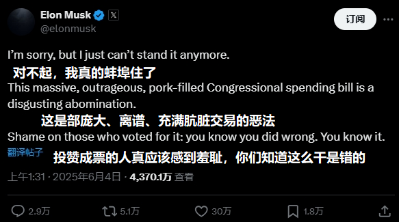 幾天之後,馬斯克正式退出特朗普領導班子,從政府效率部卸任,緊接着的6月3日,馬斯克在社交媒體上發文,公然抨擊**“大而美法案”,將其形容為“令人作嘔”,是一部龐大、離譜、充滿骯髒勾當的惡法**。馬斯克還炮轟所有投贊成票的議員,認為他們應該感到羞恥。