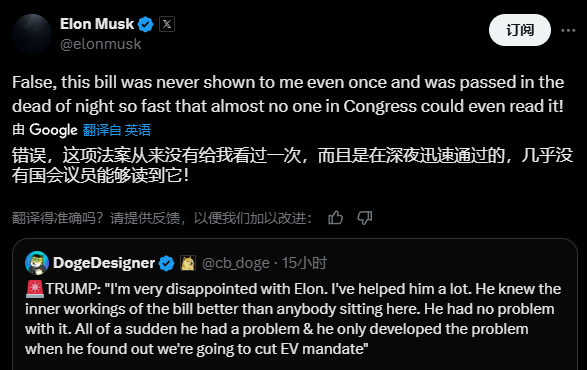 這下馬斯克更激動了,當即轉推反駁,説自己一次都沒看過“大而美法案”,這玩意是在深夜閃電戰式通過的,投票的國會議員都沒幾個人讀過。