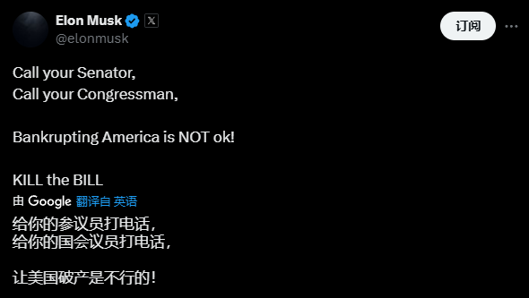 然而馬斯克並不領情,還在繼續炮轟法案,次日他再度發文稱,新法案大幅增加了政府債務的規模,讓政府效率部過去削減開支的努力,全部付諸東流,會導致美國破產。他呼籲叫民眾站出來,給自己支持的政客打電話,要求他們扼殺該“大而美法案”。