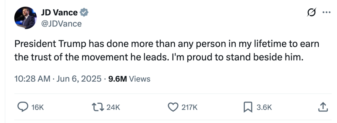 不過,當馬斯克在X上發帖支持萬斯,呼籲彈劾特朗普並由副總統接替他的位置時,萬斯立即站隊表態:“特朗普總統為贏得他所領導的運動的信任所做出的貢獻,在我一生中無人能及。我很自豪能與他並肩作戰。”